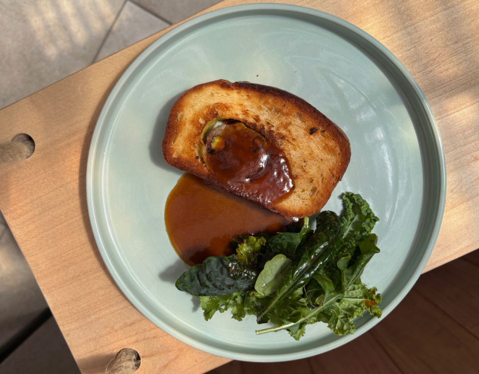 Aujourd’hui, il signe une cuisine de bistrot moderne, conviviale et généreuse, inspirée des bouchons lyonnais : pâté en croûte, saucisse briochée, magret de canard au risotto de taro, œufs Bénédicte ou advocado toast selon la saison